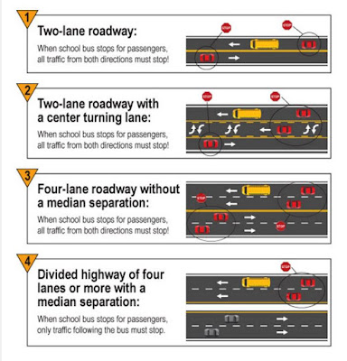 5) As placas U-Turn, não são permitidas caso existam placas indicando que naquele ponto isso não é permitido. 6) Ônibus escolar (Schoool Buses): Uma das leis que mais admiro, respeito as crianças/adolescentes. Nesta lei, você tem que parar quando ônibus escolar der o aviso, com atenção nas regras: