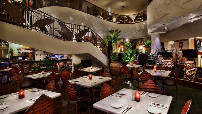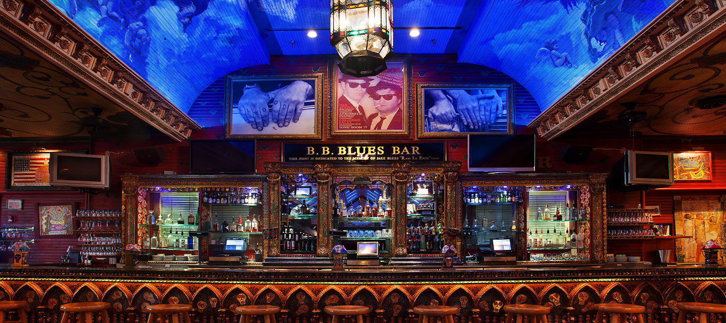 Crossroads at House of Blues apresenta pratos tradicionais como jambalaya creole, hambúrgueres suculentos, tacos, bolo de carne enrolado em bacon defumado em madeira de macieira.