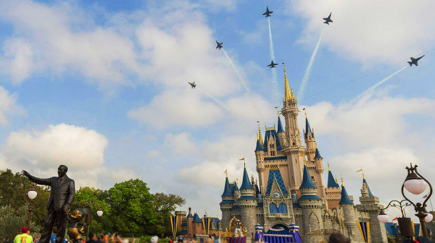 Quem estiver visitando o Magic Kingdom nesta próxima quinta-feira – dia 06 de abril de 2017 – durante o período da manhã, mais especificamente das 09h30 às 10h00 é bom ficar de olho no céu, pois os famosos U.S. Navy Blue Angels irão passar por duas vezes sobre a Main Street U.S.A. Em 2015, eles já executaram uma exibição similar, para milhares de convidados quando seis jatos F/A-18 Hornet sobrevoaram a Main Street U.S.A. a mais de 250 milhas por hora (402 km/h) antes de executar uma manobra denominada Delta Break sobre o Cinderella Castle.
